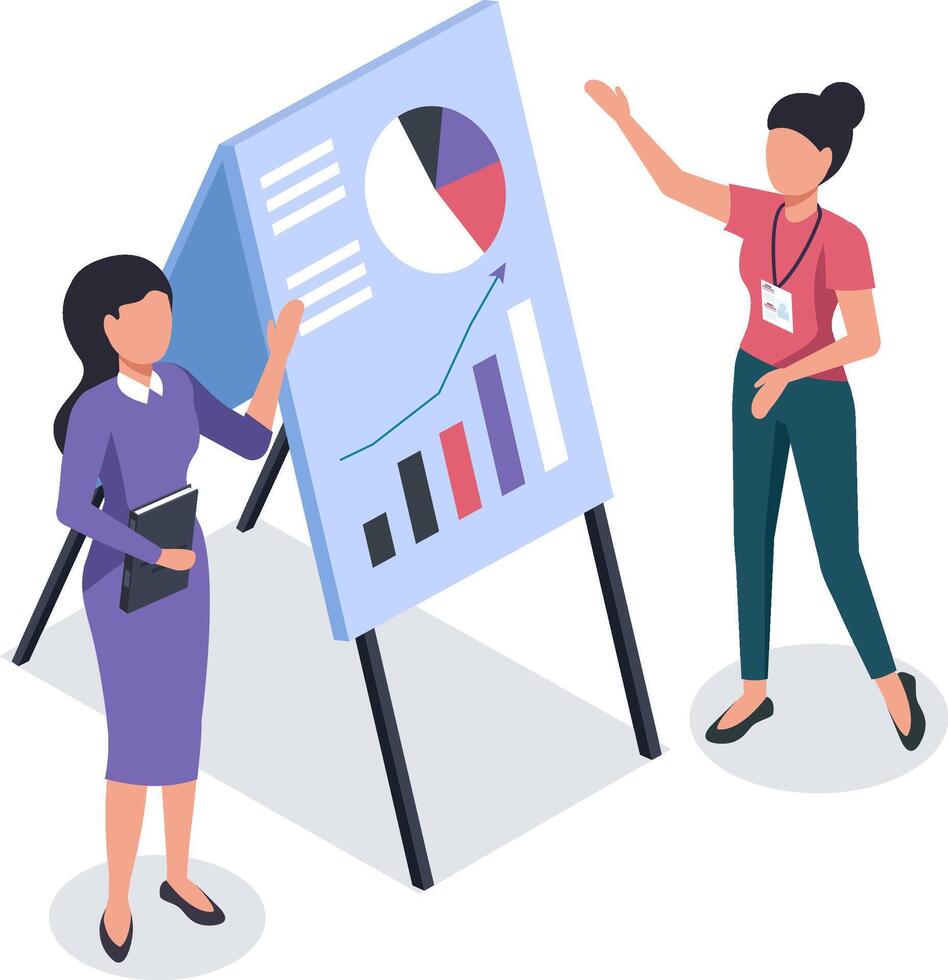 Two businesswomen presenting marketing data analysis on a whiteboard using bar and pie charts, explaining positive growth and business strategies during a meeting Pro Vector