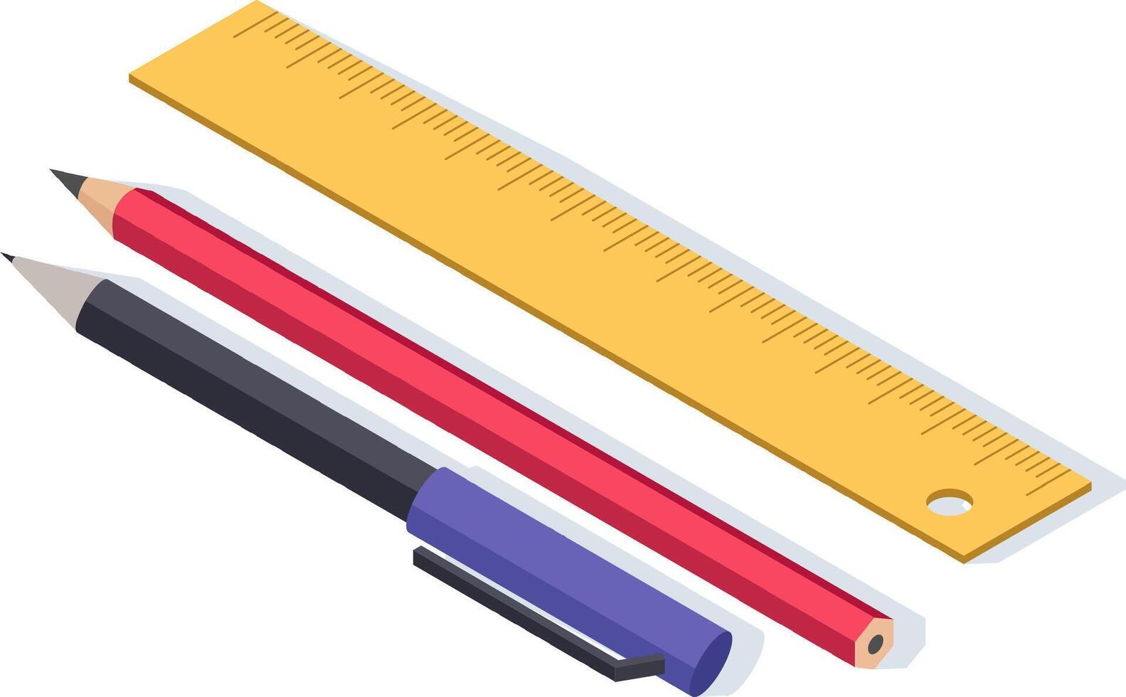 Wooden ruler and two pencils, a graphite pencil and a pen, lying on a white surface, composing a basic stationery set for technical drawing, engineering, architecture or geometry Pro Vector