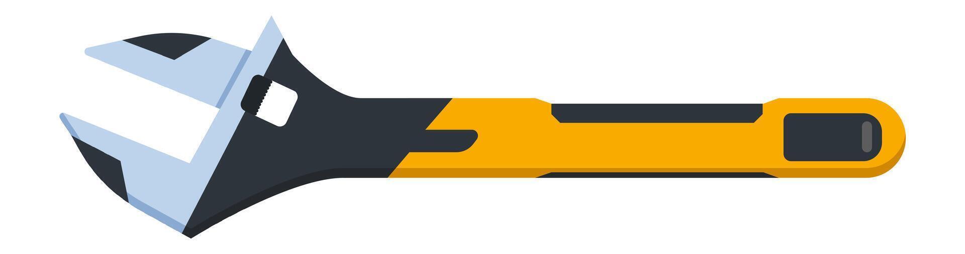 Modern adjustable wrench with ergonomic yellow and black handle lying horizontally isolated on white background, useful tool for plumbers and mechanics Pro Vector