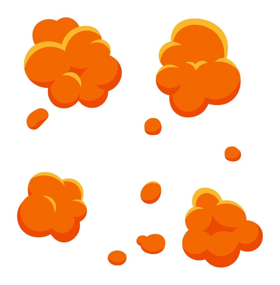 Four vibrant orange dust clouds exploding, creating a stunning visual effect with dynamic particles expanding against a clean white background, delivering a powerful and energetic design element Pro Vector