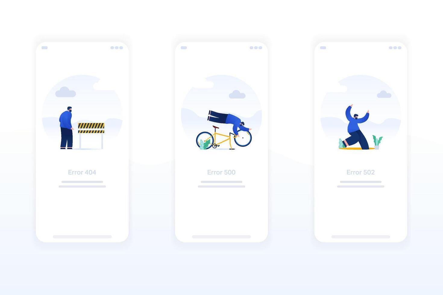 Fun UI error screens for missing pages, server fails, and empty data flat and modern. Pro Vector