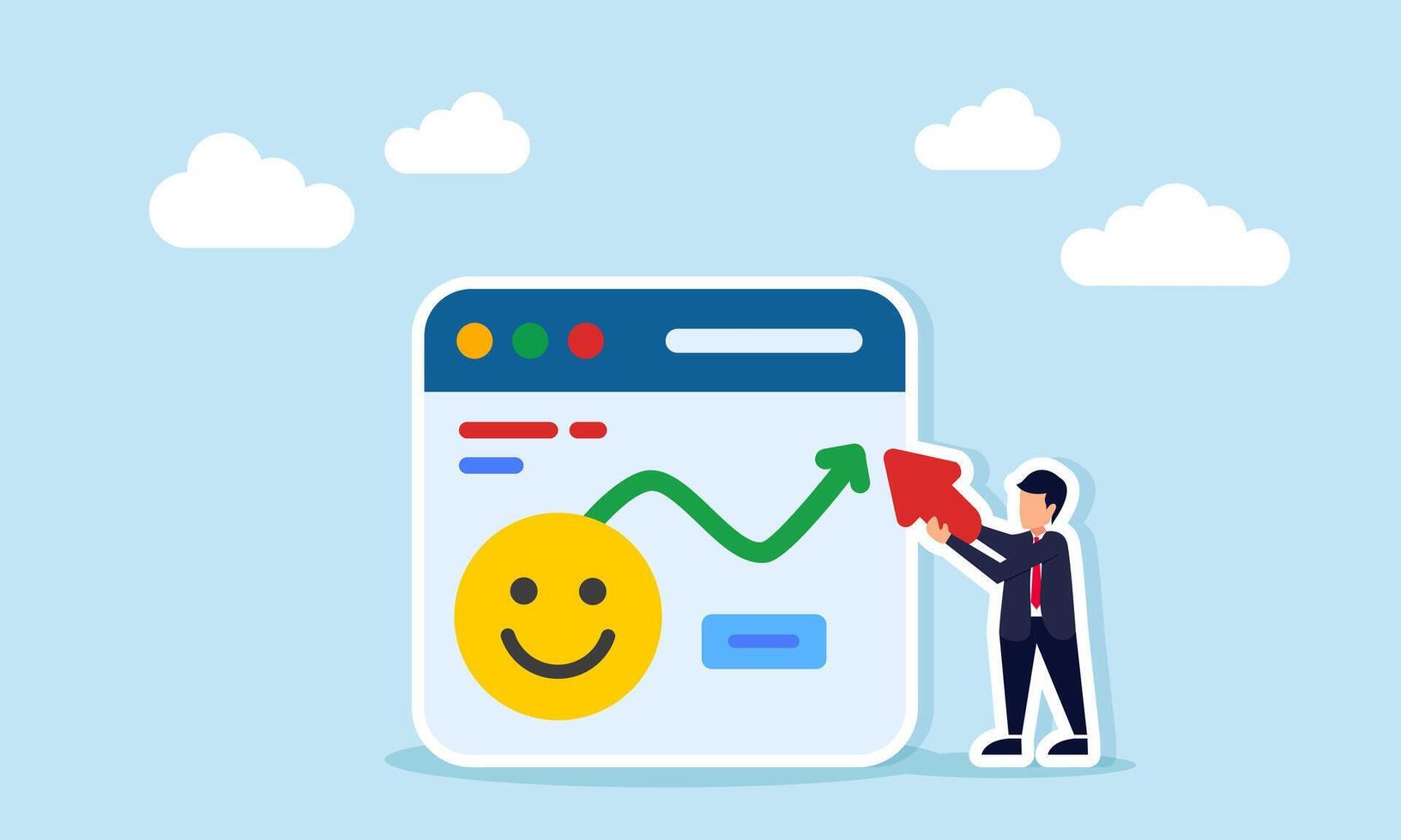 Businessman Pointing Cursor at Line Chart on App Interface with Happy Emoticon Illustration of Public Attention and Positive Response Growth Pro Vector