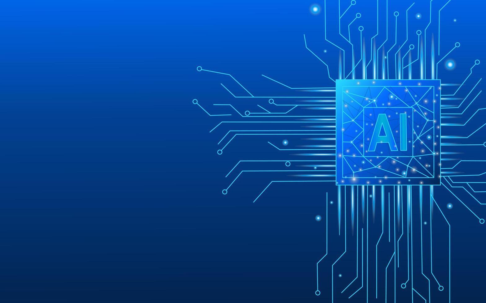 Top view of AI chip on blue technology background and circuits, artificial intelligence concept. Pro Vector