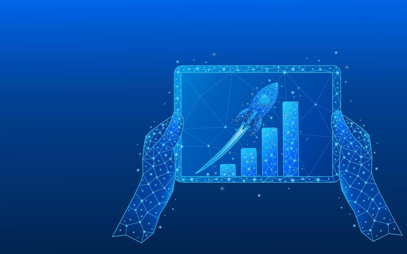 Hands holding tablet in foreground showing abstract rocket powered graph Pro Vector