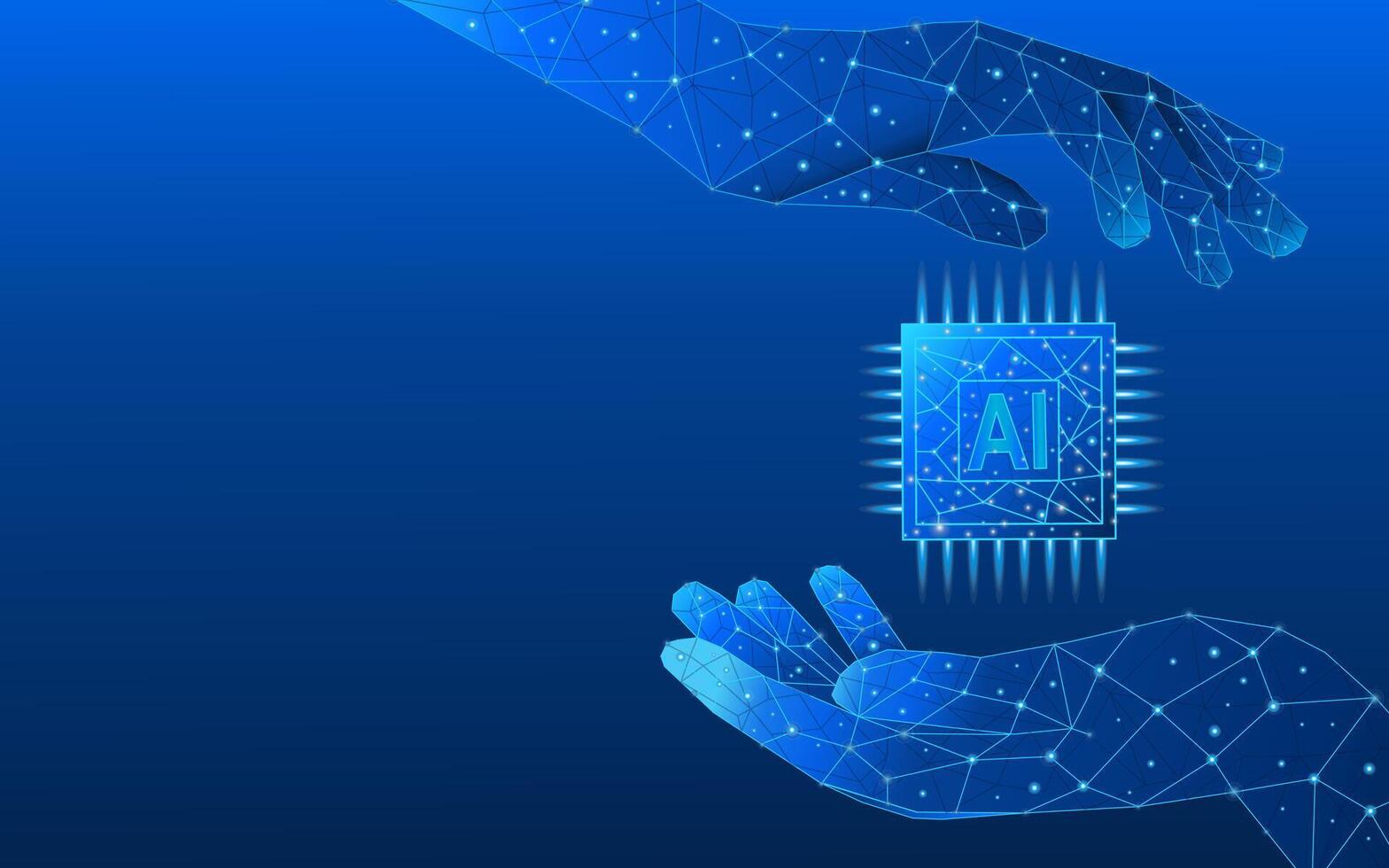Abstract digital AI chip between low poly technology wireframe palms Pro Vector