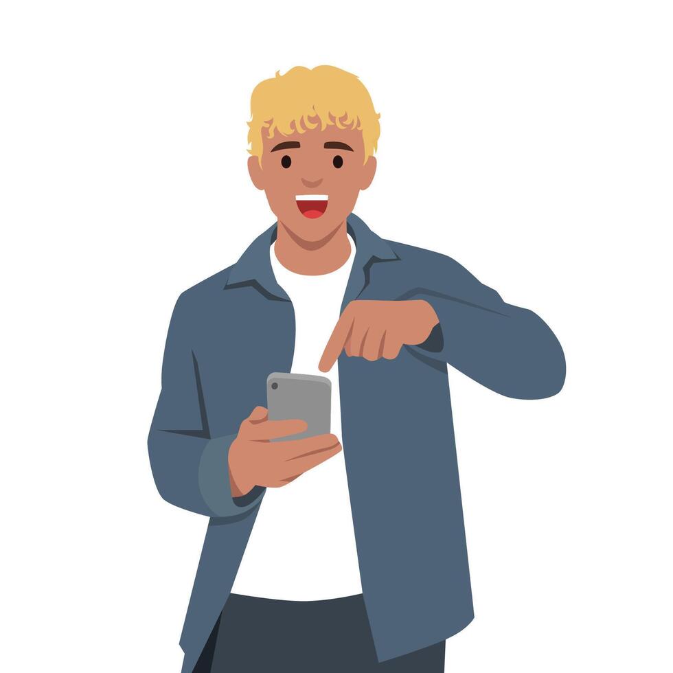 Man with blond hair and a cheerful expression is using a smartphone, pointing at the screen. Pro Vector