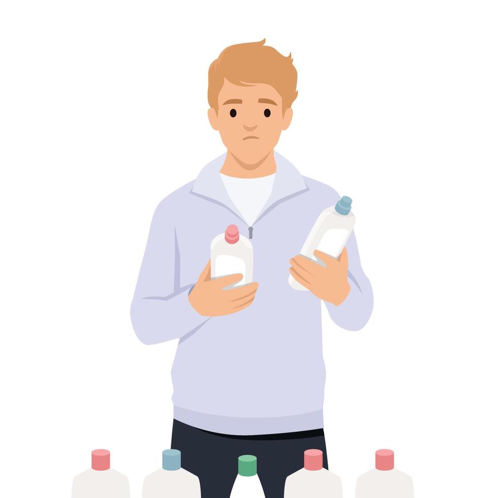 Man appears uncertain as he tries to choose between different cleaning product bottles at shopping. Pro Vector