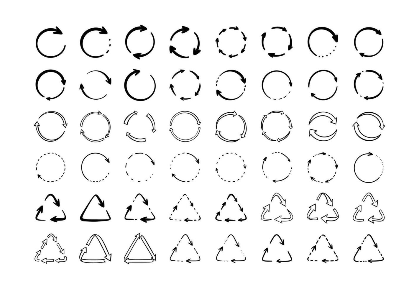 Set of hand drawn doodle recycle, reuse, refresh symbols. Spinning round rotate dotted arrow. Dash motion, movement sign. Eco friendly concepts crayon scribble design elements. Plastic waste mark Pro Vector