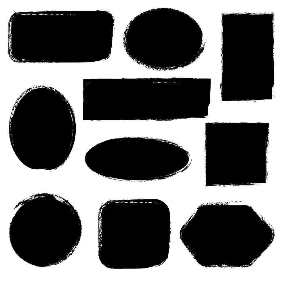 Brush painted frames, different stamp shapes set. Hand drawn grunge textured geometric elements, square, rectangle, oval and circle text borders. Pro Vector