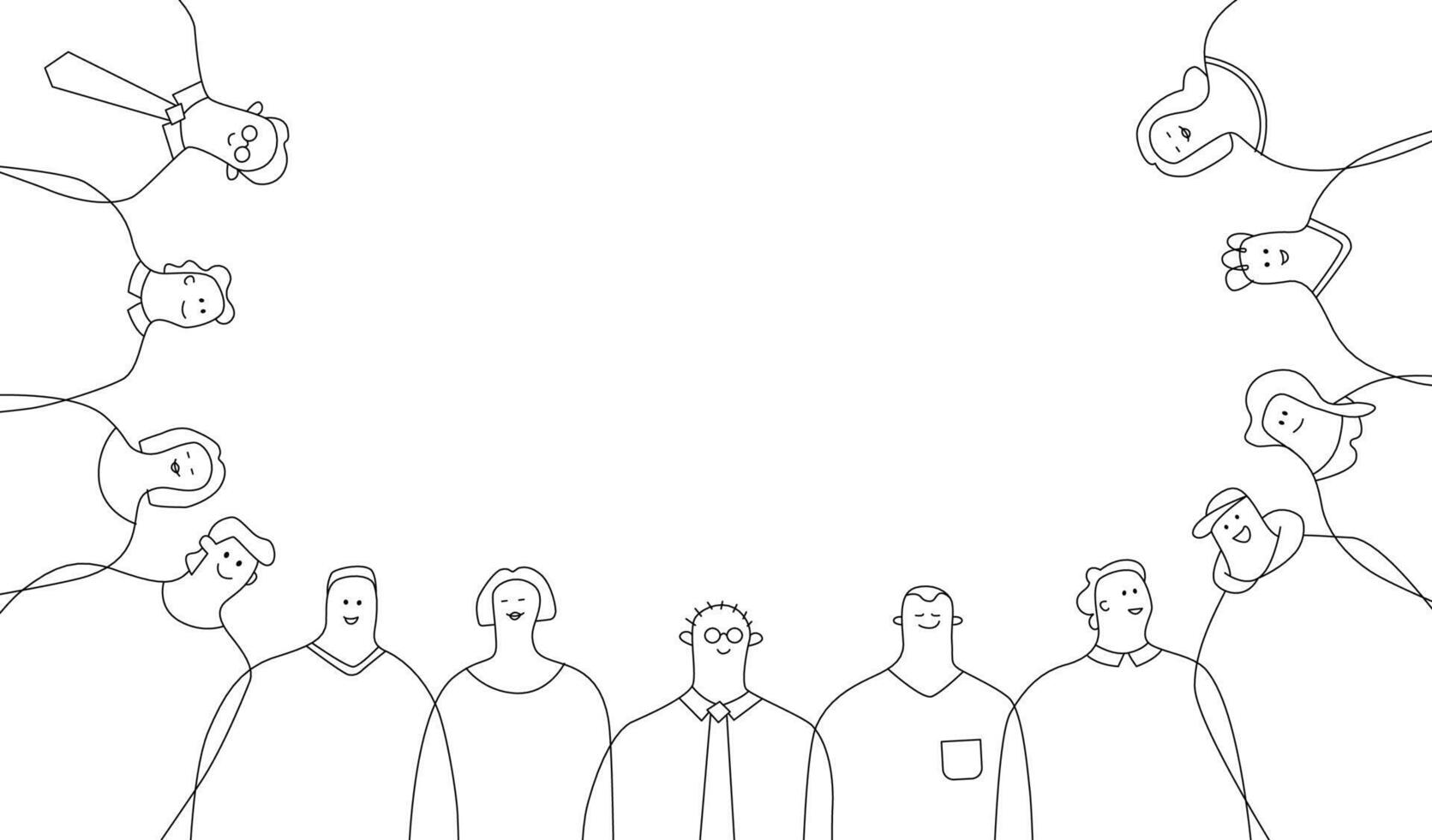 A minimalistic crowd of various human figures in the shape of a semicircle. Linear abstract characters with an empty space in the middle. Free Vector