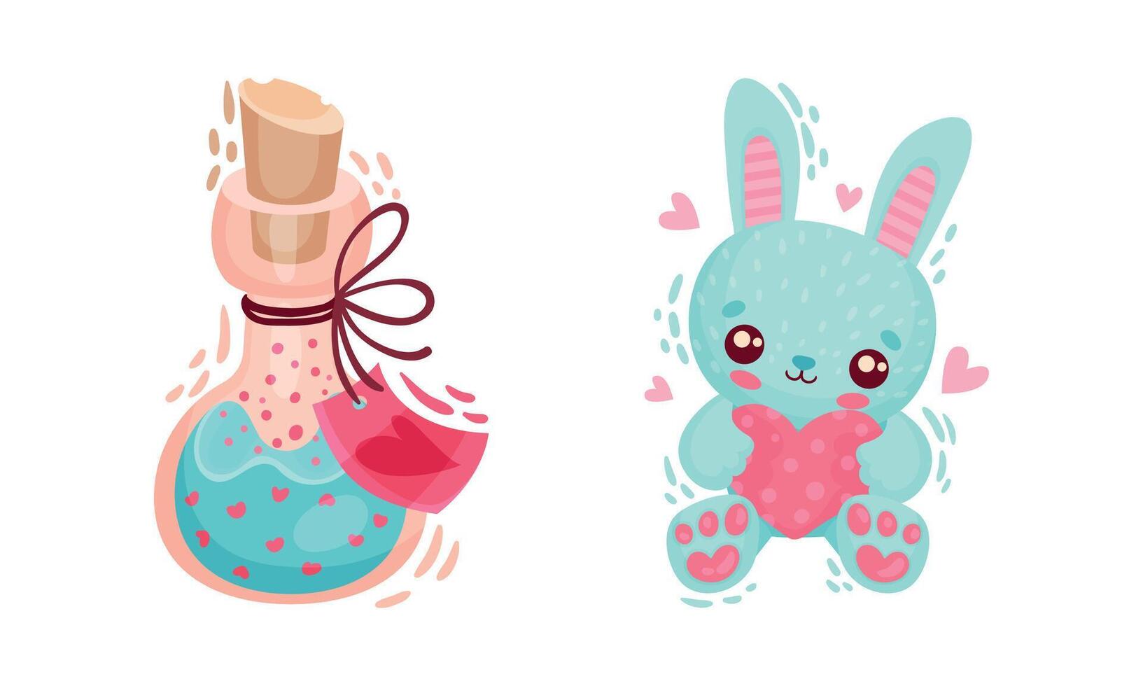 Hare with Heart and Glass Jar with Elixir as Saint Valentine Day Symbol Set Pro Vector