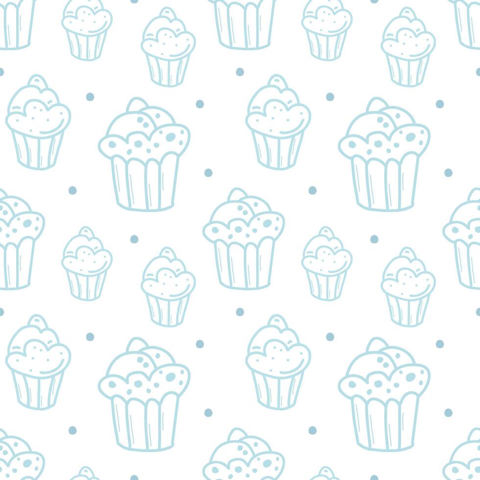 Abstract blue pattern, background of elements and delicious cupcake. Funny simple texture, doodle style. Pro Vector