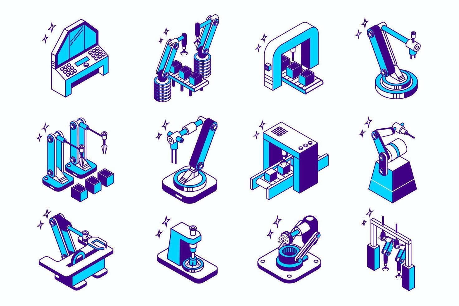 Robotization industry concept 3d isometric icons set for web isometry design. Collection elements of robots, robotic arms packaging, conveyor manufacturing, smart factory, more. illustration. Pro Vector