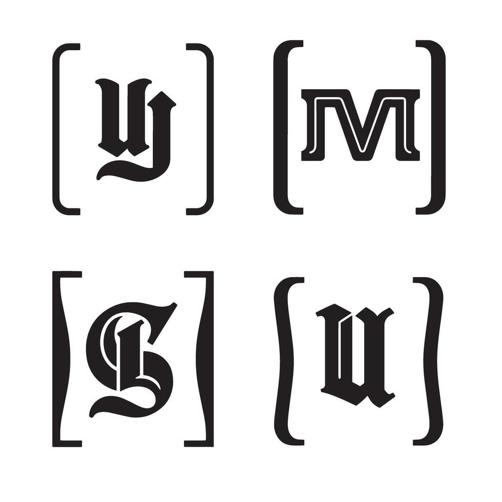 Bold gothic lettering compositions in black silhouette within square brackets displaying unique graphic elements Pro Vector