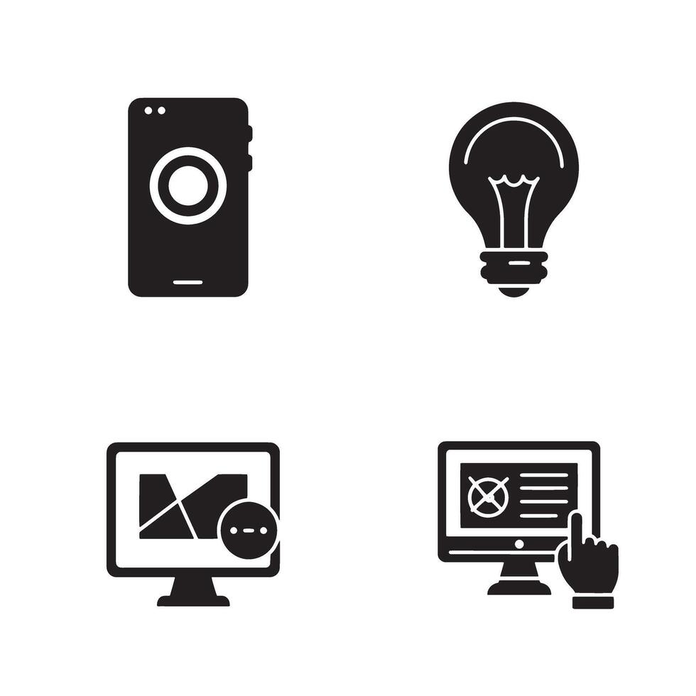 Set of modern black icon designs including a remote control a lightbulb and two computer screen concepts vector