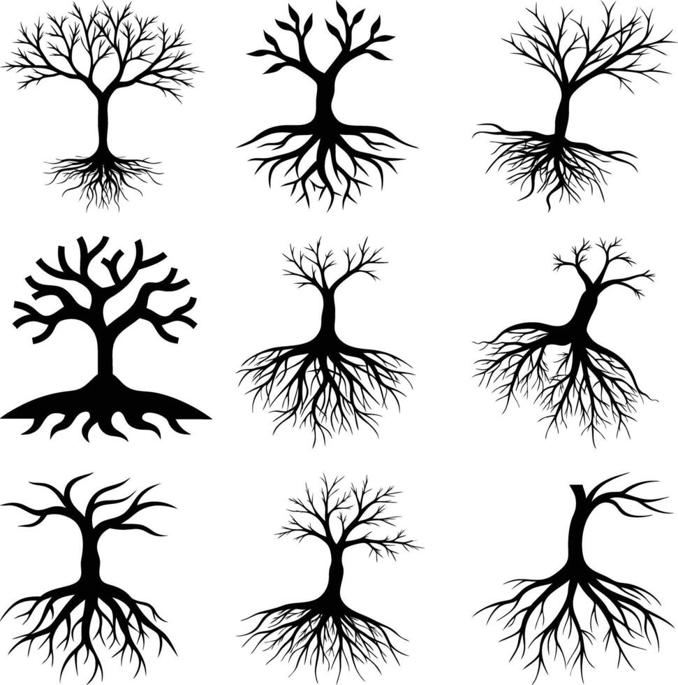 Isolated black tree silhouettes show various root systems and distinct branch structures across a white background Pro Vector