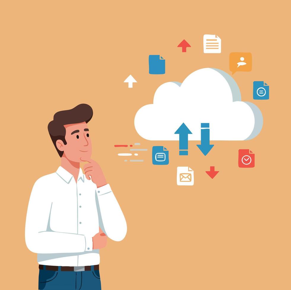 Man Thinking About Cloud Storage Technology Data Transfer and File Sharing Concept Pro Vector