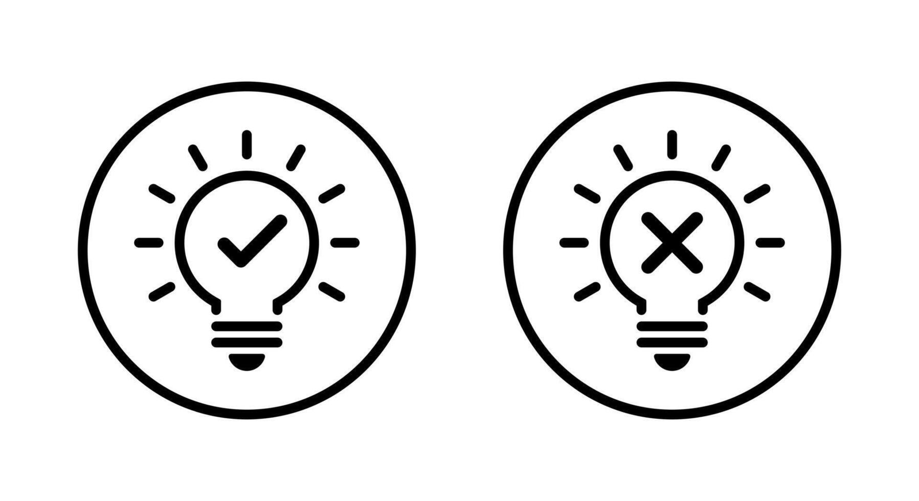 Light bulb check and cross mark icon on circle line. Business lamp with checkmark and x sign symbol Pro Vector