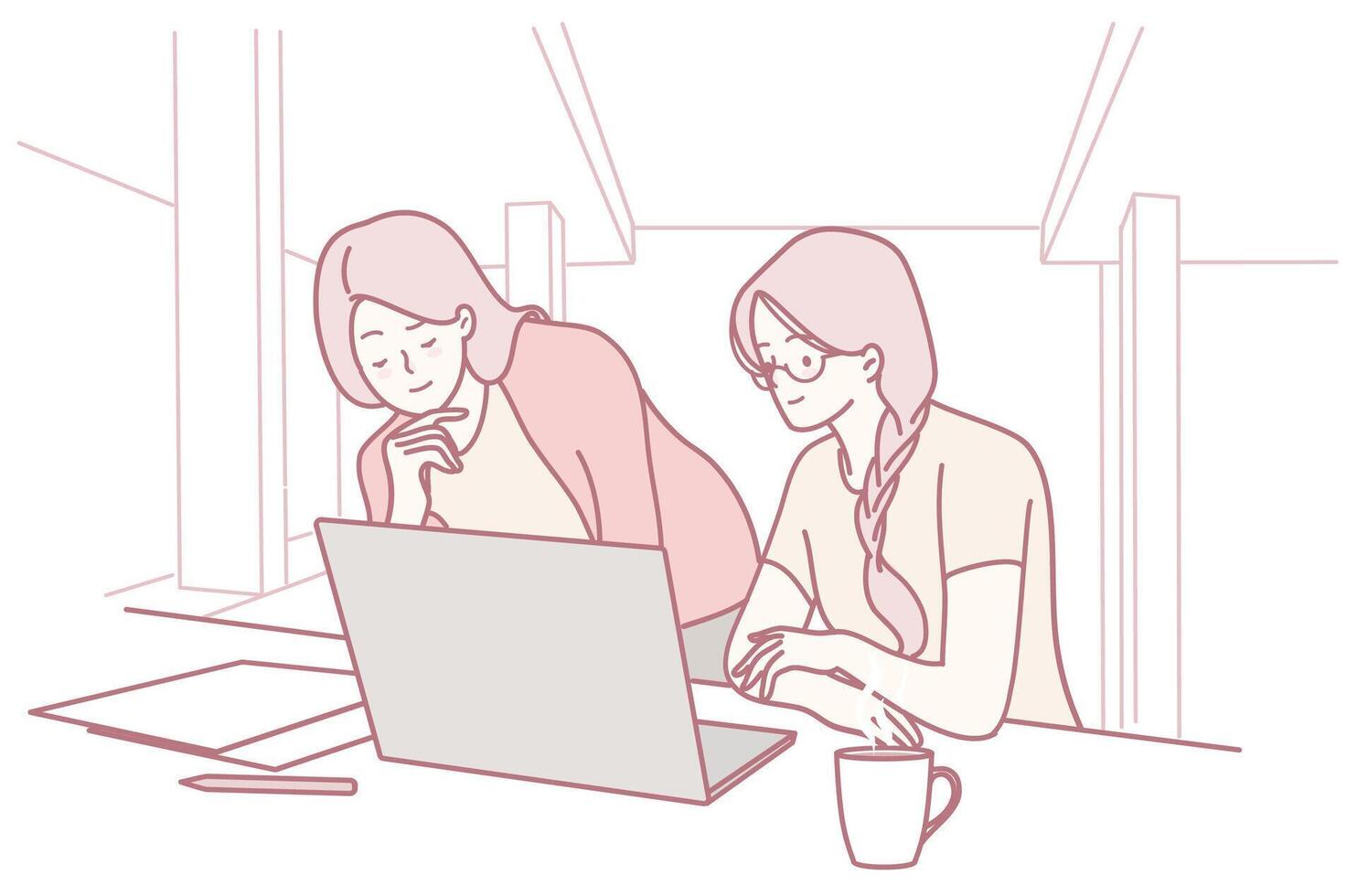 Two women are collaborating effectively while working over a laptop in a modern workspace setting Pro Vector