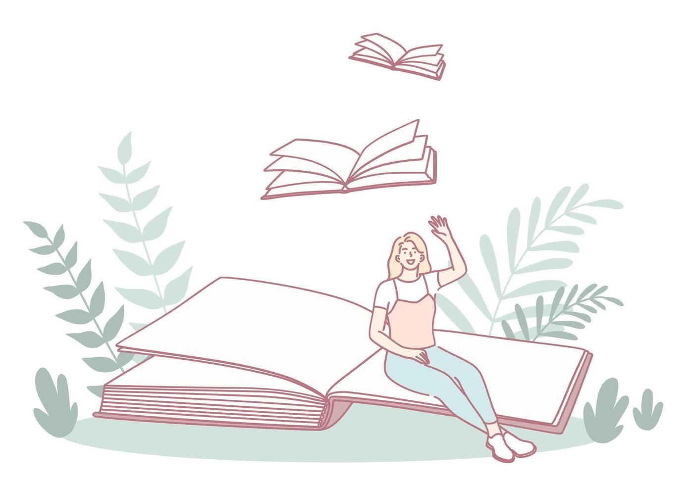 Experience a dreamy reading atmosphere where open books blend with nature, creating magic Pro Vector