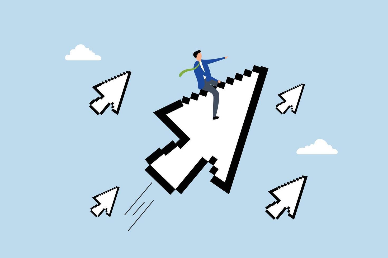 digital marketing, businessman riding digital pixel mouse pointer to click on button. Pro Vector