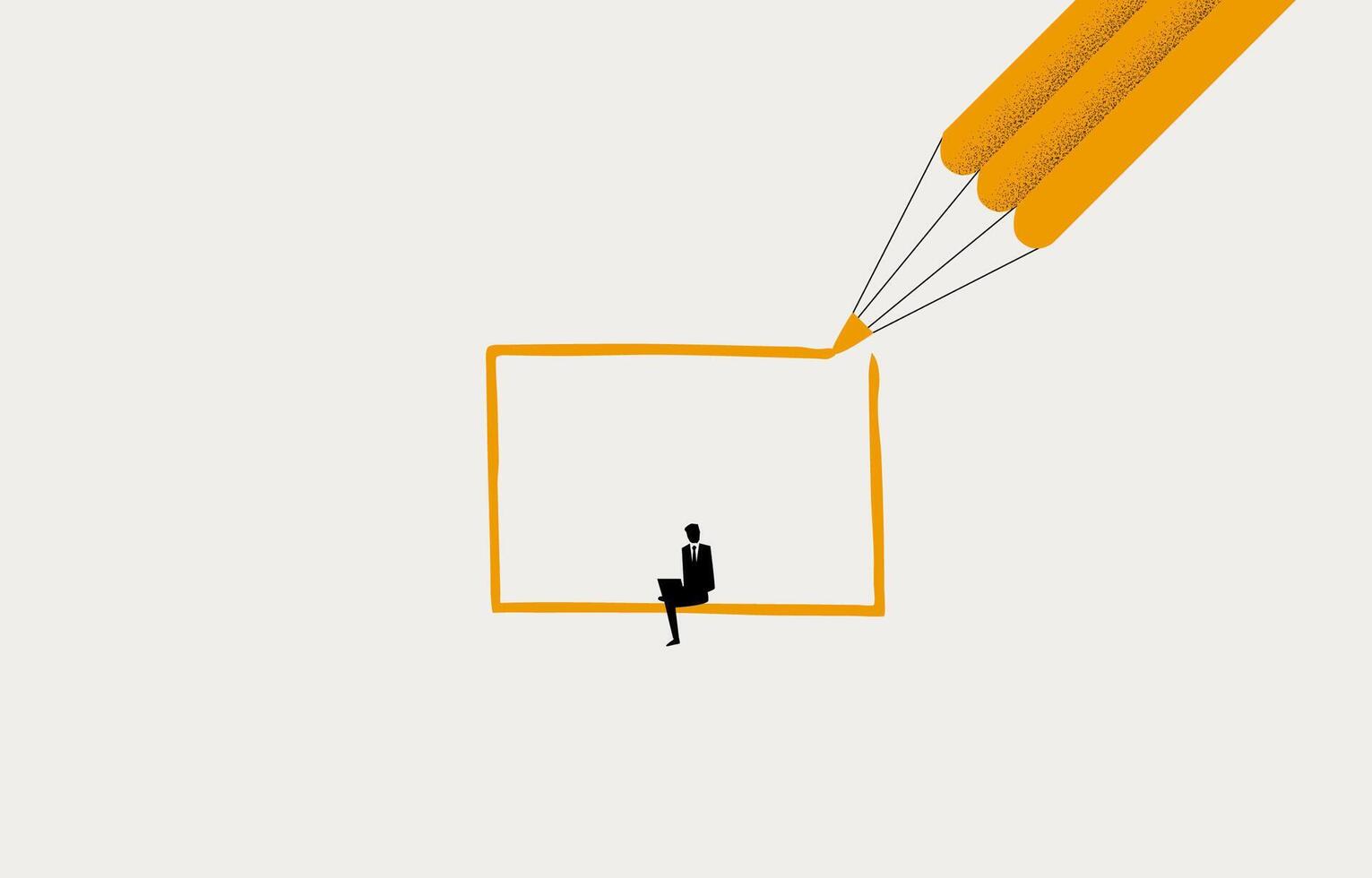 Businessman working in a large pencil drawn frame, working framework concept, minimal business design. Pro Vector