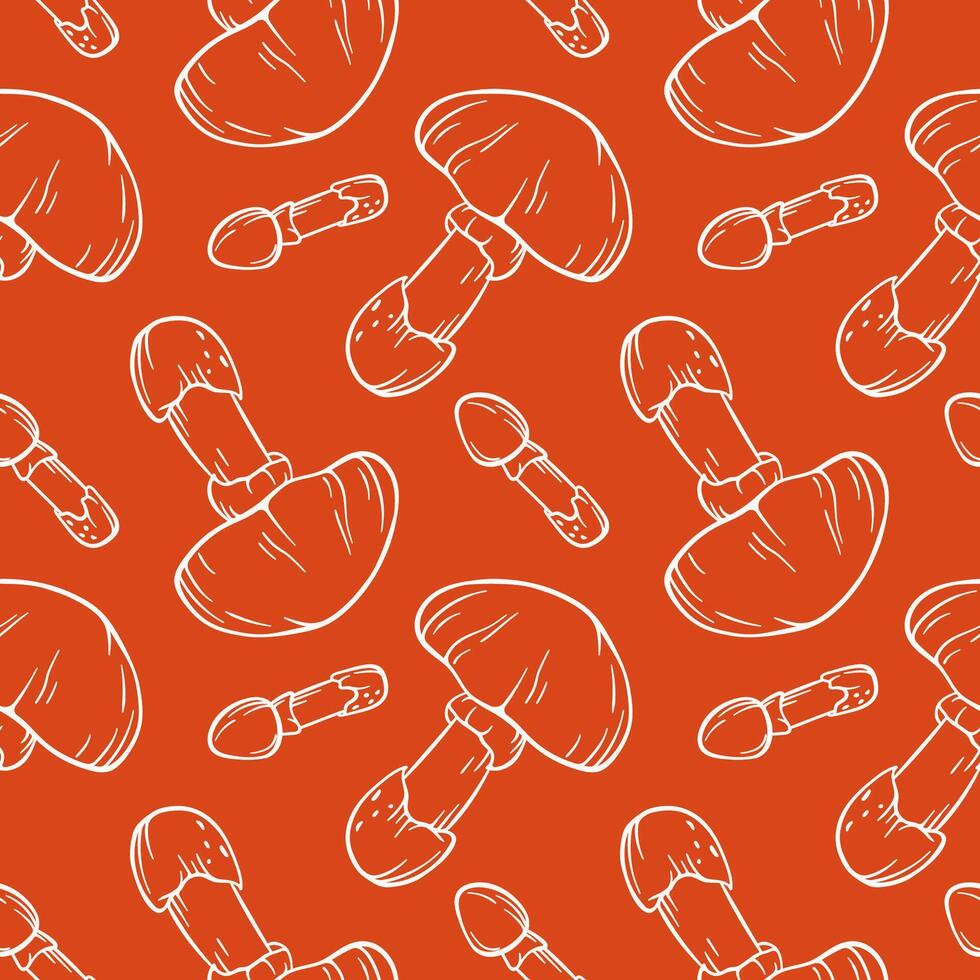 Seamless pattern with Caesars mushrooms in line art style. Autumn design for wrapping paper, wallpaper, textile on a red background. vector