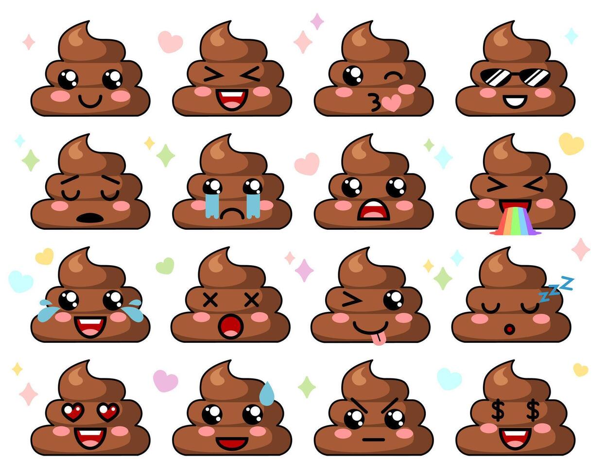 Kawaii poop emoji set. Collection of with different moods. Set of poo with different expressions of faces. illustration isolated on white background Pro Vector