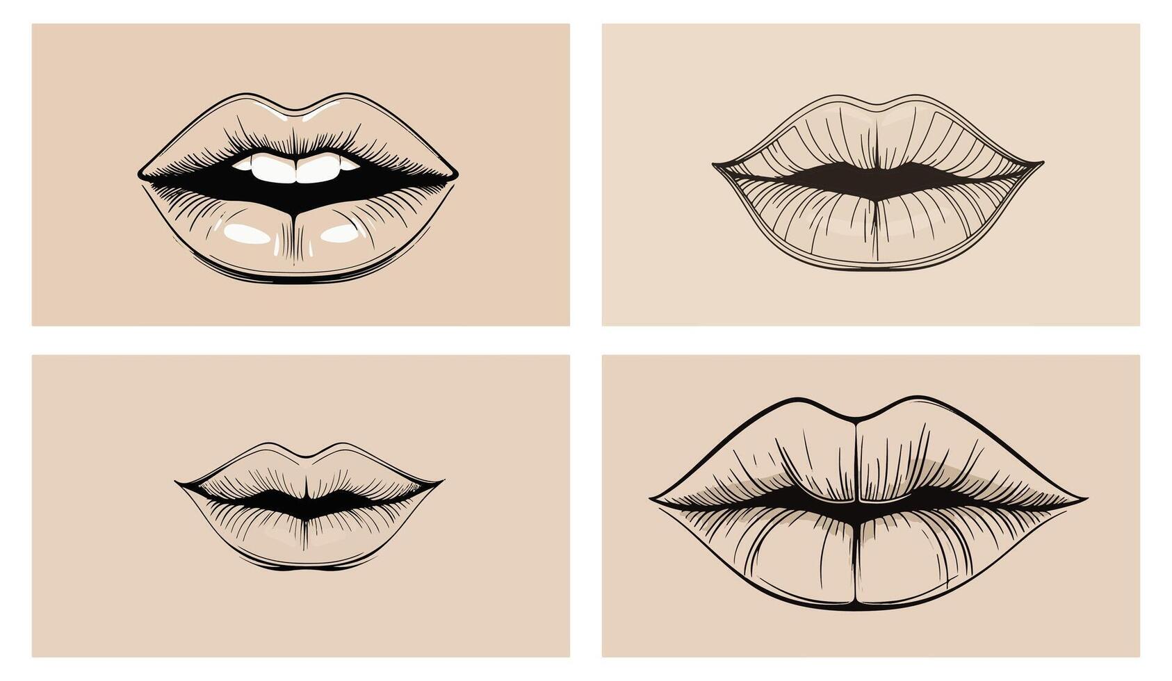 Minimalistic linear drawing of lips with elegant black outline on a soft beige background creates a sophisticated modern look vector