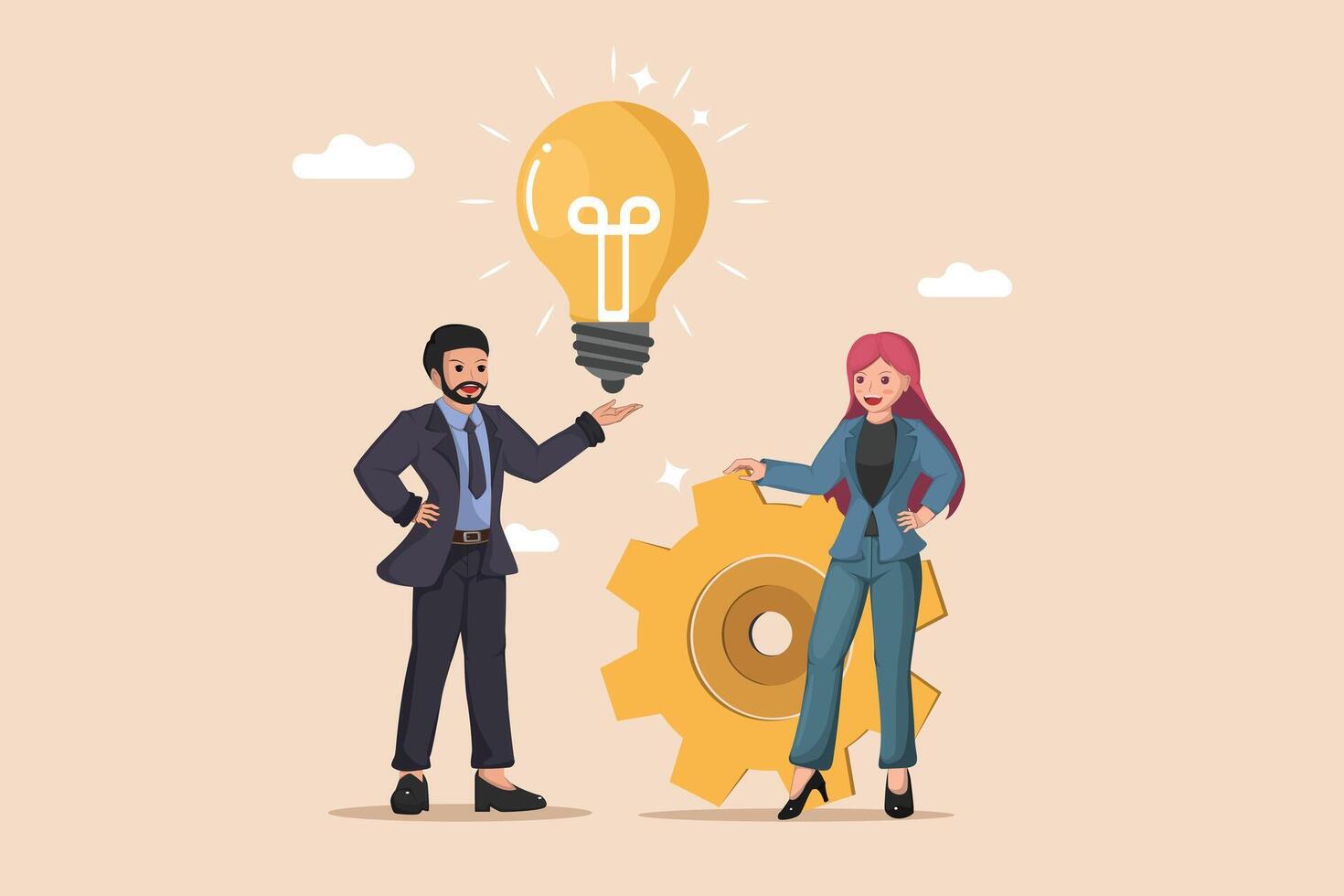 Idea Generation and Implementation Businessman Presenting a Lightbulb While Businesswoman Interacts with a Gear, Symbolizing Turning Ideas into Action. Pro Vector