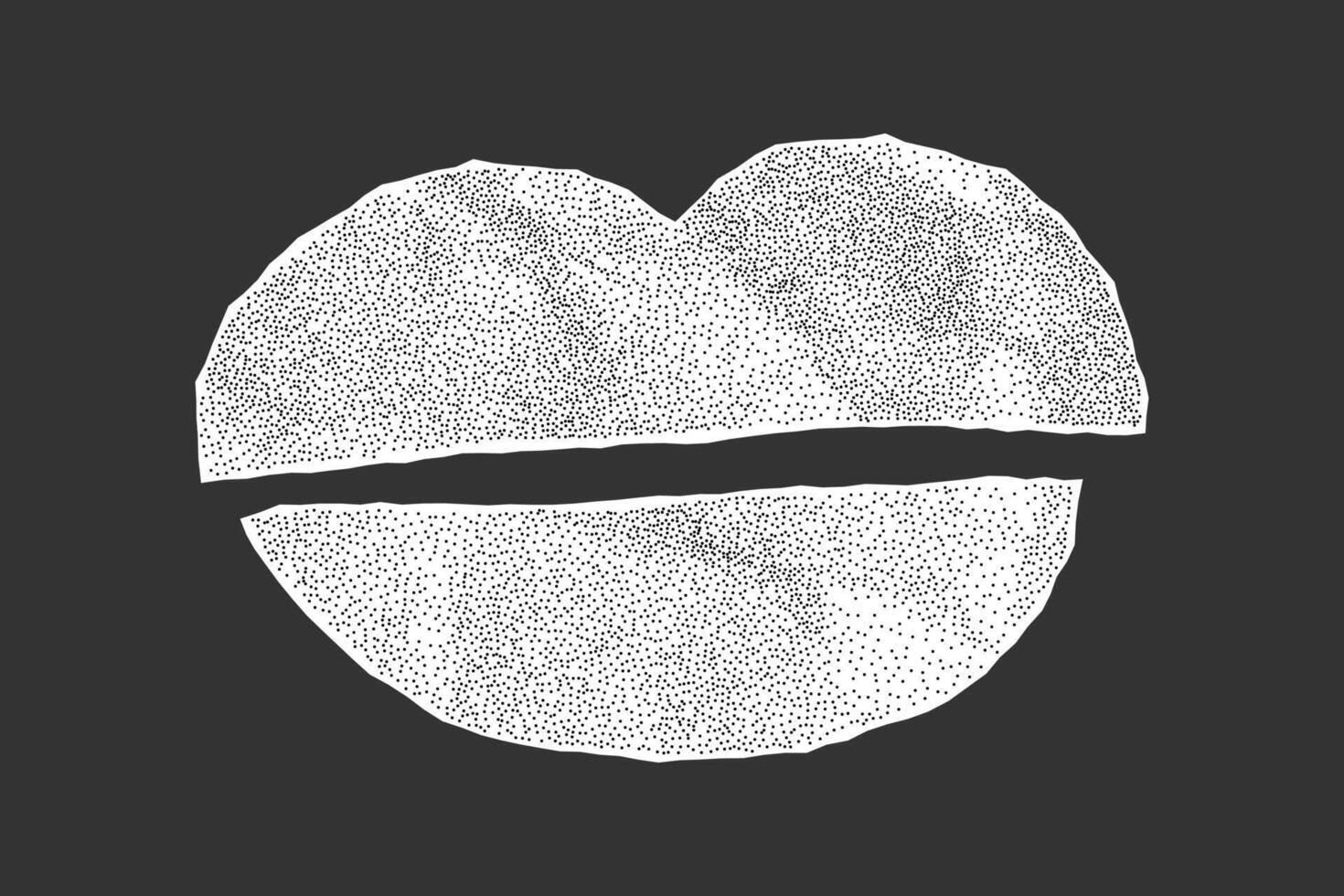 Torn white paper lips with jagged edges and crumpled texture on dark background. Abstract geometric collage sticker with halftone and gritty surface. Pro Vector