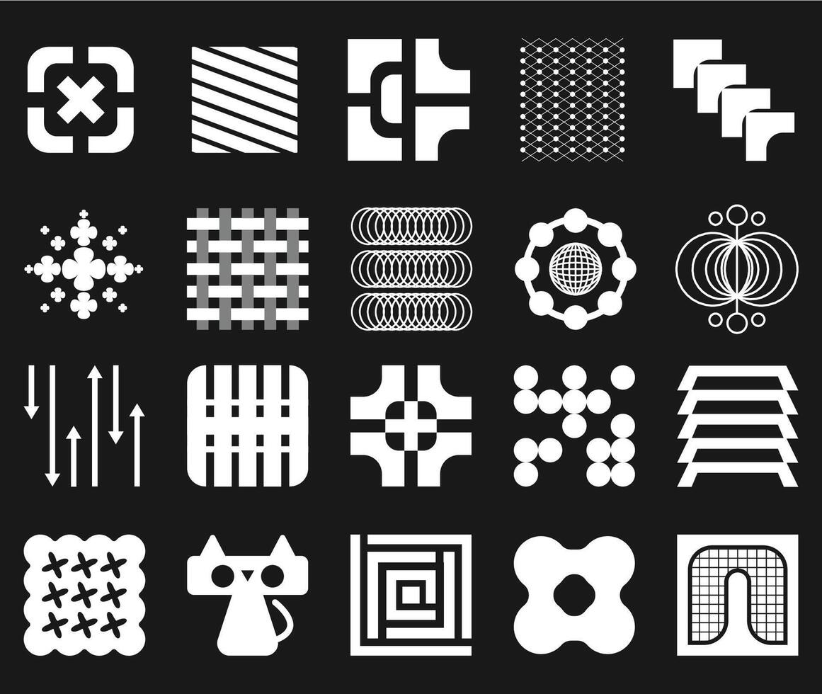 Retro futuristic elements for design. Collection of abstract graphic geometric symbols and objects in y2k style. Templates for pomters, banners, stickers, business cards. Pro Vector