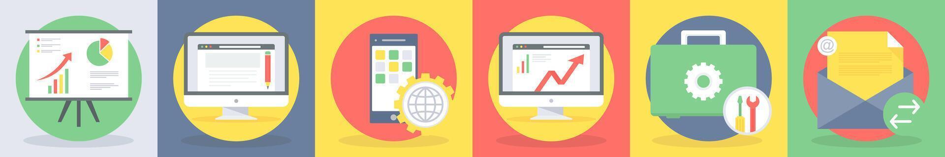 5 round seo icons as report graph, web content Pro Vector