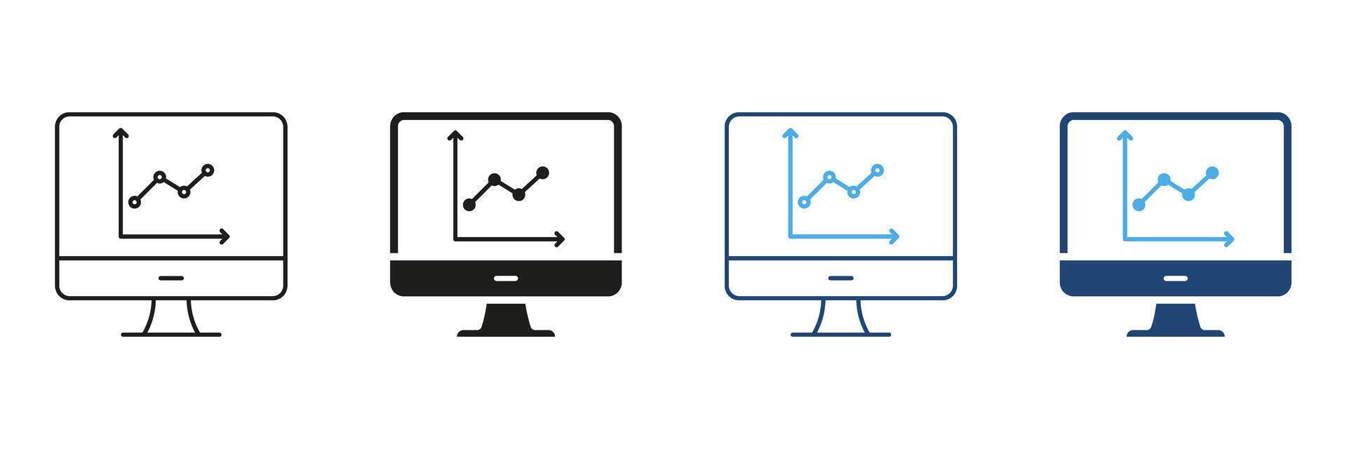 Computer Monitor With Graph Line And Solid Icon Set. Data Analysis, Business Analytics, Performance Tracking Symbol Collection. Financial And Statistical Visualization. Isolated Illustration Pro Vector
