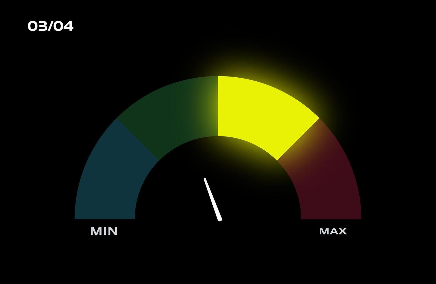 Futuristic Gauge Meter Element. Neon Speedometer Dashboard Graphic. SciFi Performance Level Indicator. Pro Vector