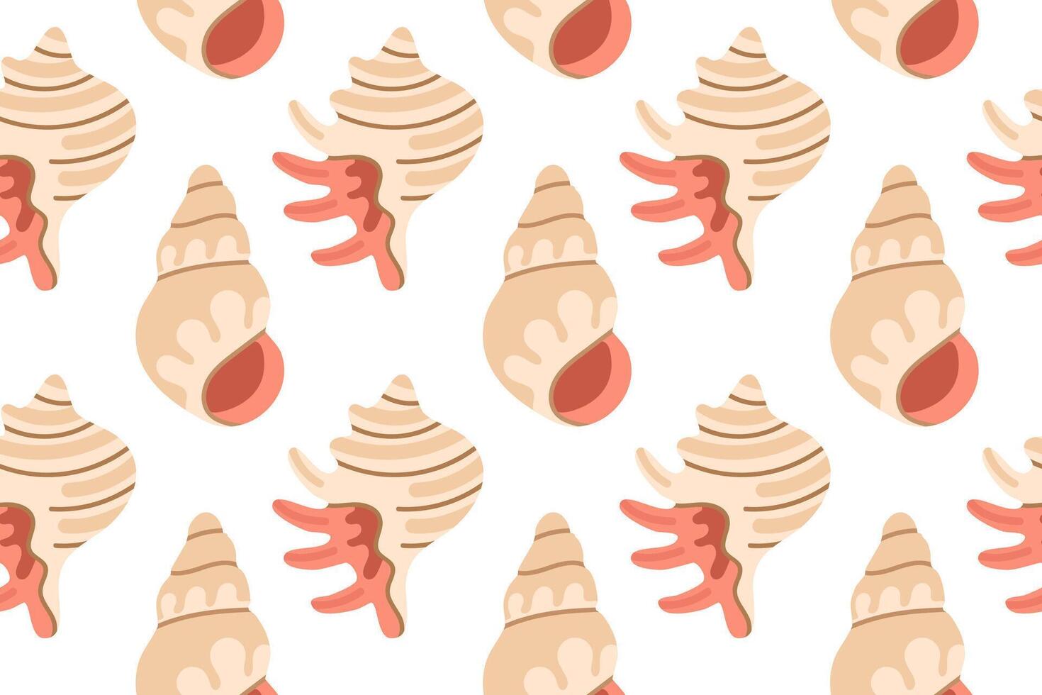 Seamless marine pattern with beige conch shells and red coral branches on a white background, ideal for beach and summer designs Pro Vector