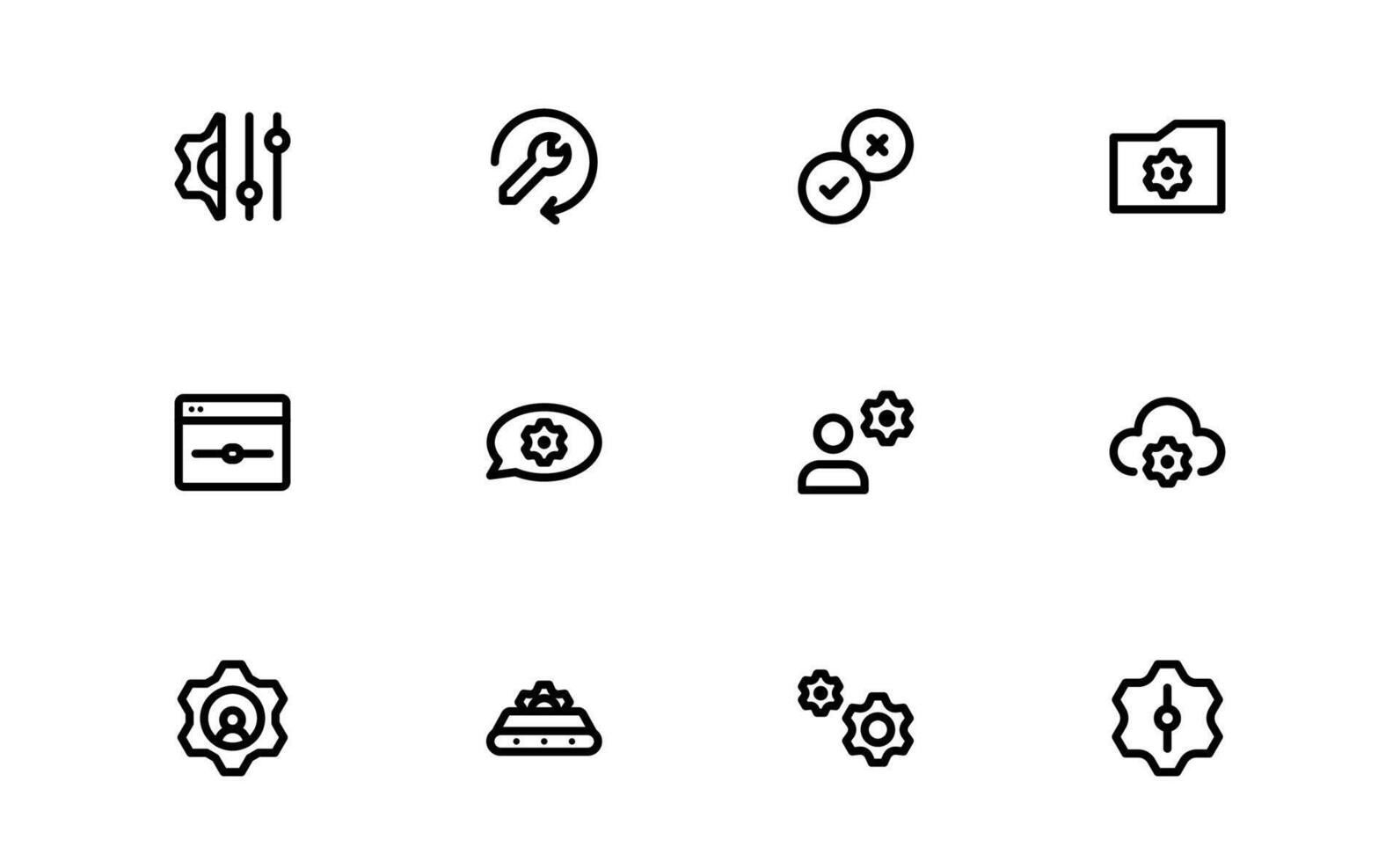 Settings Icon Pack collection. Scalable Graphics for Adjustment, Optimization, and Fine-Tuning of Applications and Systems Pro Vector