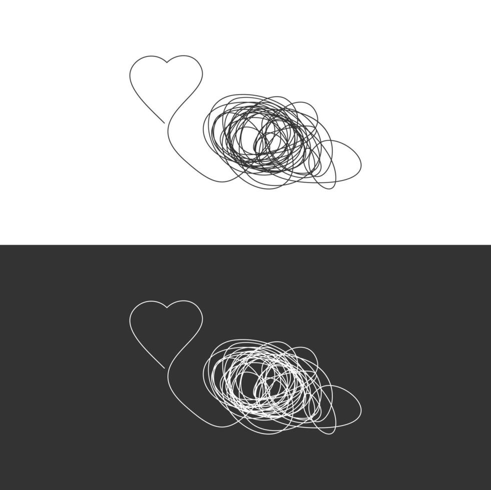 One continuous line drawing of tangled and scribble wires with love symbol. Concept of complex problem solving process and psychoterapy Pro Vector