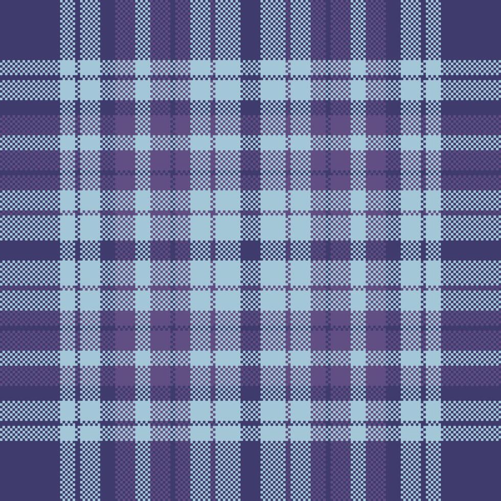 Retro pixel art tartan pattern. Pixelated fabric texture in shades of purple and blue. Nostalgic, game design, or textile background. Great for digital projects. Pro Vector