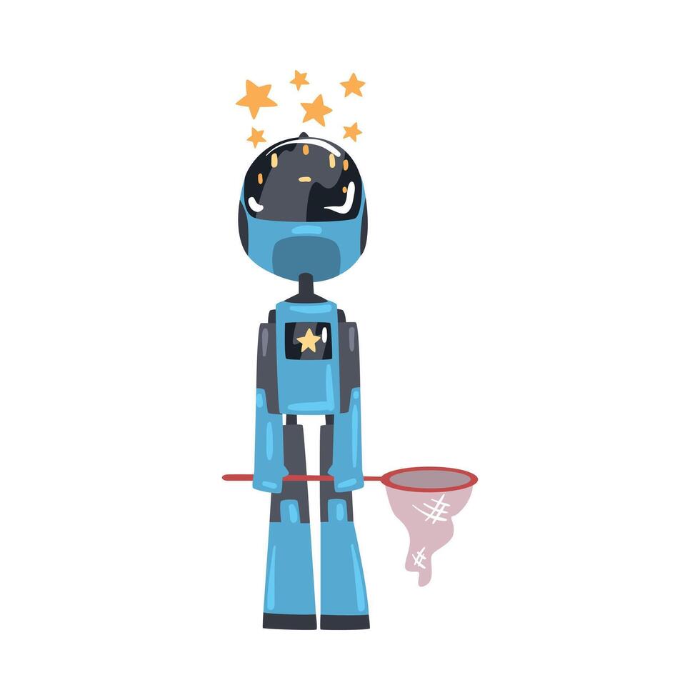 Friendly Robot with Net and Stars over its Head, Cute Personal Robotic Assistant Character, Artificial Intelligence Concept Cartoon Style Illustration Pro Vector