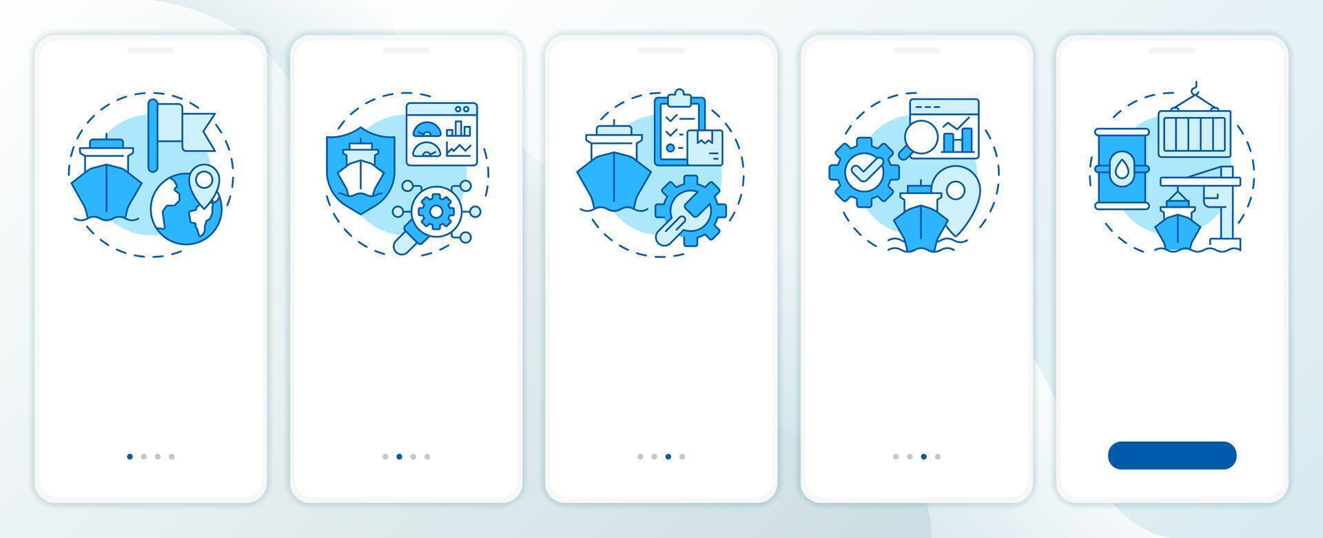Ship management system solutions blue onboarding mobile app screen. Walkthrough 5 steps editable graphic instructions with linear concepts. UI, UX, GUI Pro Vector