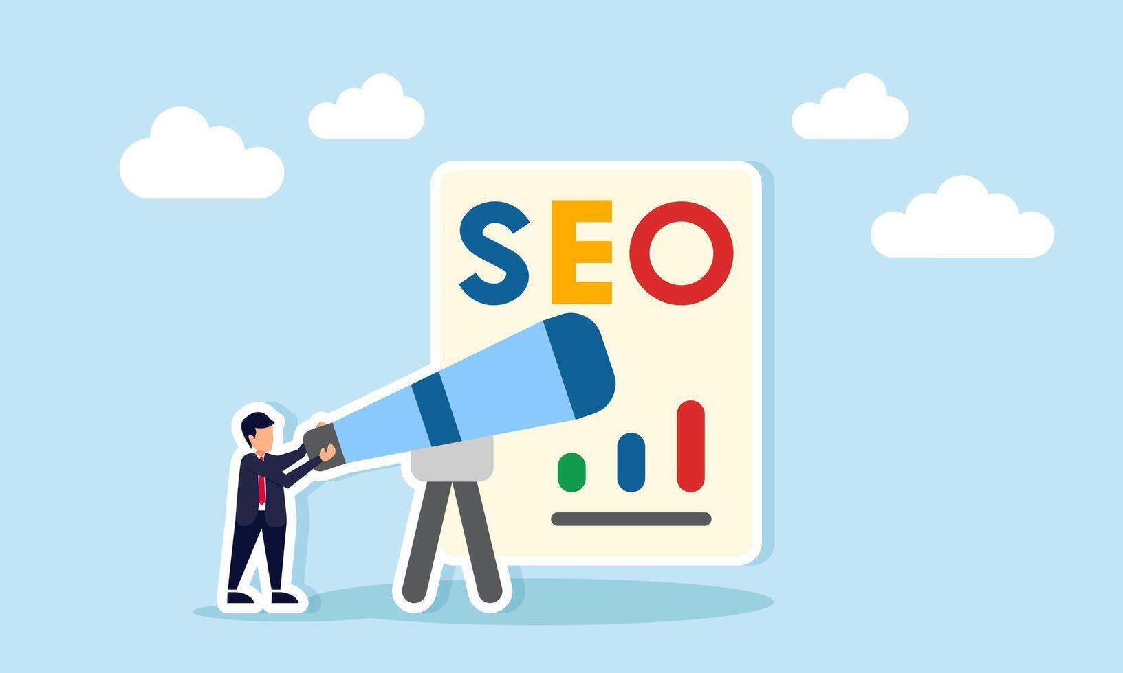 Businessman looking at paper with SEO text and graph illustration of monitoring and analyzing keyword optimization results by SEO Pro Vector