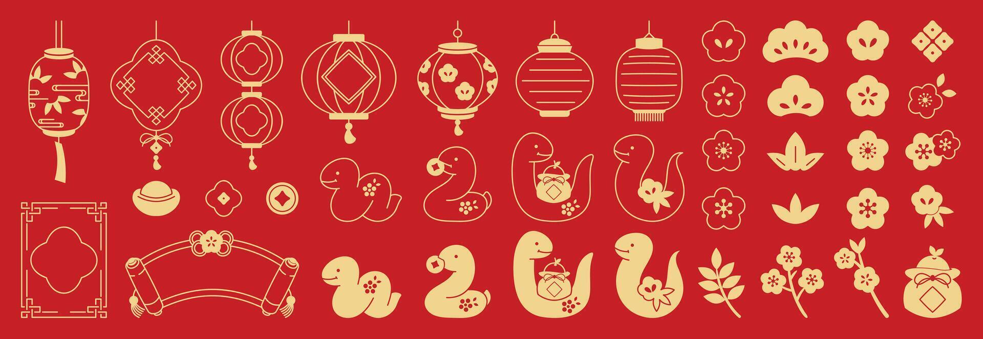 Happy Japanese new year, Year of the Snake element of frame gold coin, lantern, flower design on red background. Pro Vector