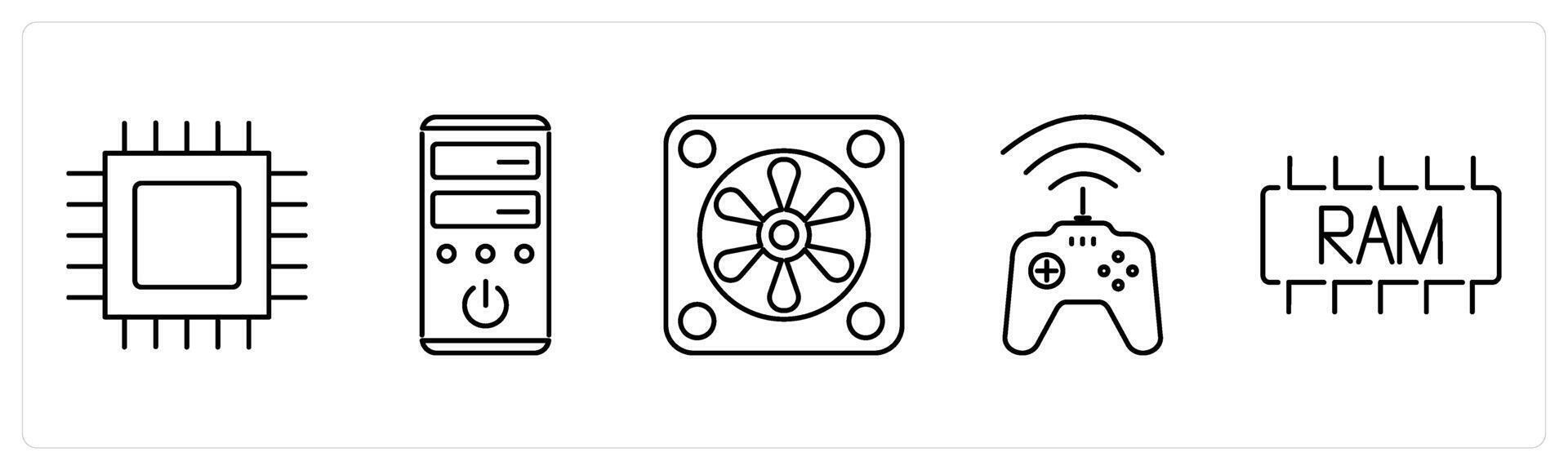 5 Computer Parts icons as cpu processor, system unit, system fan in black bold Pro Vector