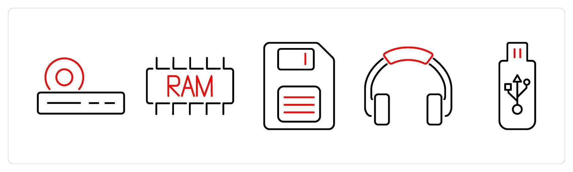 5 Computer Parts icons as cd player, ram, floppy in red bold Pro Vector