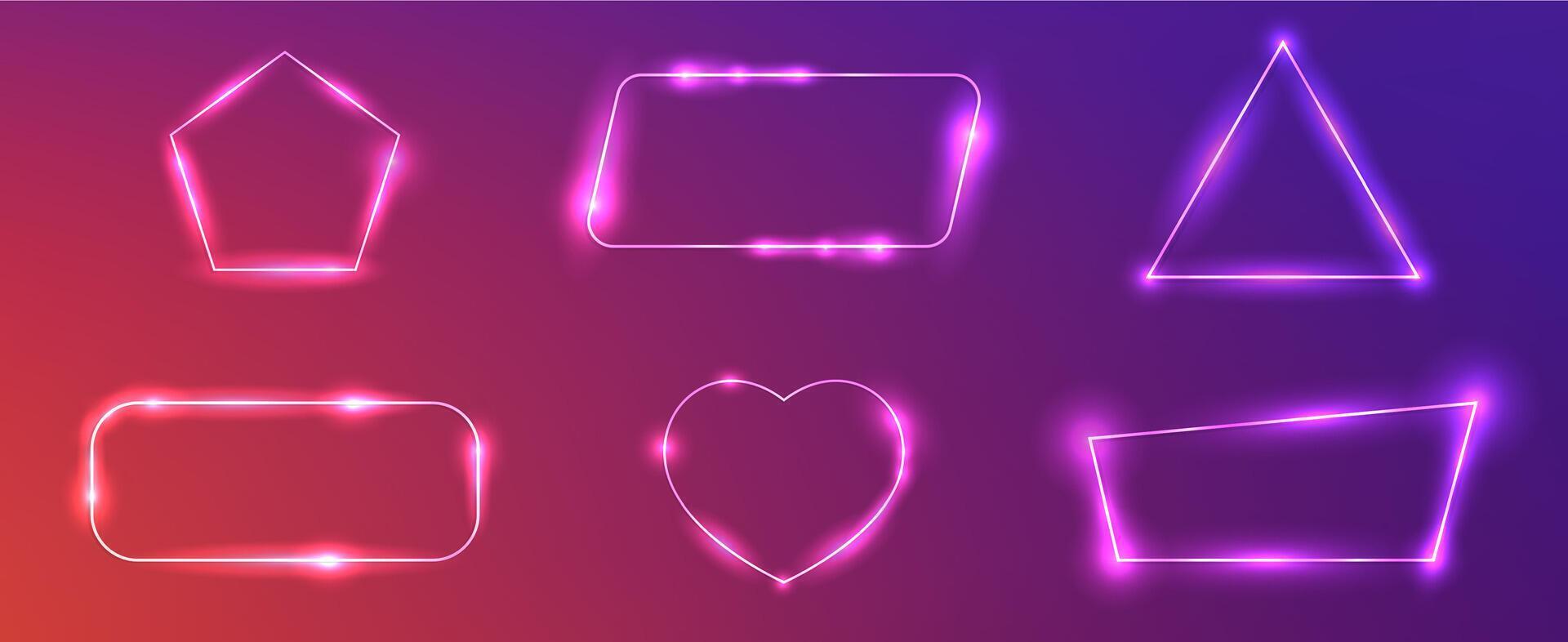 Set of six neon frames in different geometric forms with shining effects and sparkles on dark purple background. Empty glowing techno backdrop. illustration Pro Vector