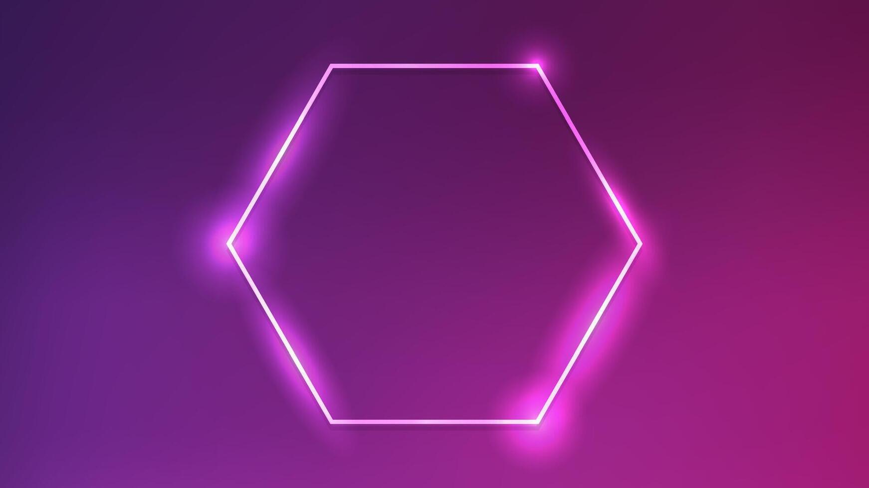 Neon hexagon frame with shining effects on dark purple background. Empty glowing techno backdrop. illustration Pro Vector