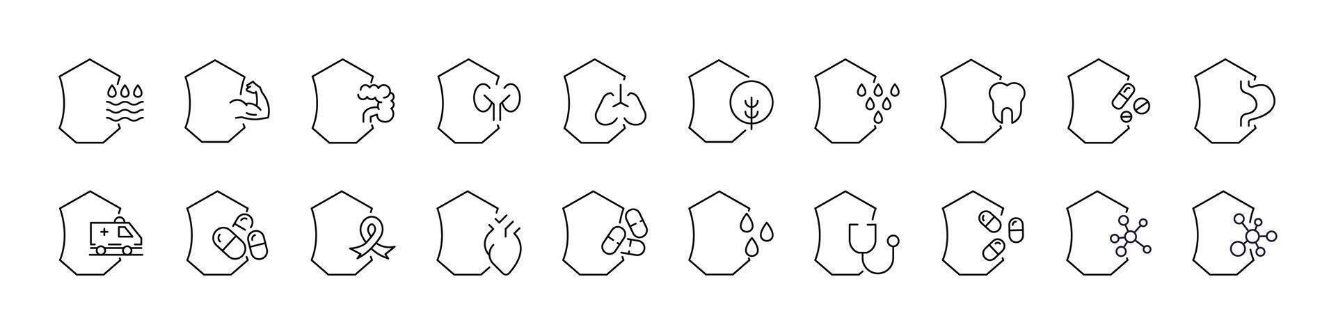 Health, Water, Tree Pictures Drawn with Thin Line. Collection of Various Design Elements that Can Be Used for Apps, Articles, Web Sites, Social Media Pro Vector