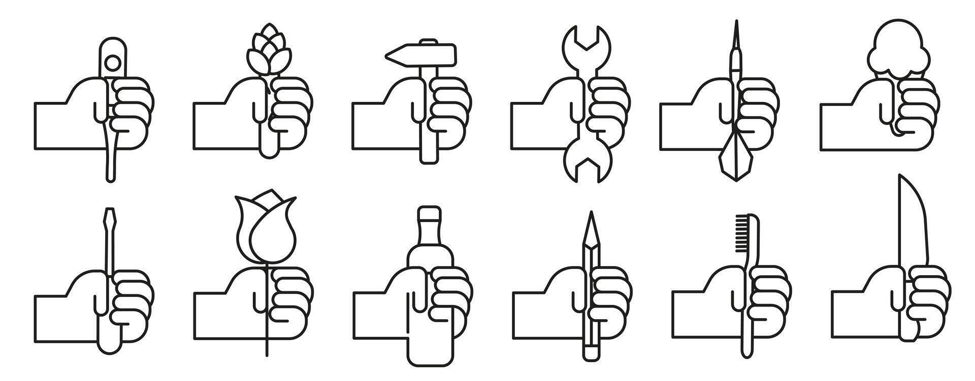 Hands holding things in a thin line. Various objects in human hands. Hand with objects set. Pro Vector