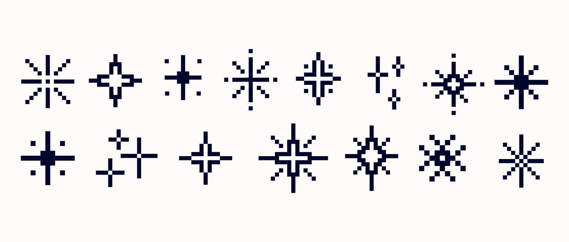 Retro star and sparkle icons set in 8 bit Pixel art style. Pixelated Light Burst . retro game design, UI effects, magical animations, collectibles, badges, pixel digital artwork. illustration Pro Vector